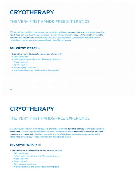 So, what is BTL Cryotherapy exactly? At its core, BTL Cryotherapy (often simply referred to as cryotherapy ) is a cutting-edge wellness treatment that involves exposing your body to extremely cold temperatures for a short period. Think of it as a supercharged ice bath, but without the messy water and with significantly more controlled temperatures. The ‘BTL’ part typically refers to BTL Aesthetics , a company renowned for its innovative medical and aesthetic devices. When we talk about BTL Cryotherapy , we’re often discussing the application of cold therapy principles using high-tech equipment designed to deliver precise and effective results, whether for localized treatment or for broader systemic benefits. The idea is to trigger your body’s natural response to extreme cold, which, surprisingly, is incredibly beneficial for recovery, pain relief, and even skin rejuvenation. We’re talking about temperatures that can dip as low as -160°C (-256°F) in a controlled environment, which sounds intense, right? But trust me, guys, it’s a quick, exhilarating experience that many find incredibly refreshing and revitalizing. This isn’t just about shivering; it’s about stimulating physiological responses that kick your body into high gear, promoting healing and overall well-being. Whether you’re an athlete looking to speed up muscle recovery , someone dealing with chronic pain, or simply seeking an anti-aging boost, BTL Cryotherapy offers a unique, non-invasive solution. It’s a game-changer for many, providing an efficient way to harness the therapeutic power of cold. The session is typically brief, often lasting only 2-3 minutes, making it a convenient option for even the busiest schedules. During this short window, your body undergoes a cascade of beneficial reactions, all thanks to the precisely controlled cold stimulus delivered by advanced BTL Cryotherapy systems. These systems are engineered to ensure safety and optimal efficacy, providing a consistent and effective cold exposure that maximizes therapeutic gains. Understanding the specific design and function of BTL's equipment helps to demystify the process, revealing a sophisticated approach to an ancient healing method. The distinction of using BTL technology often lies in the precision of temperature control and the ergonomic design of their treatment chambers or applicators, ensuring a comfortable yet highly effective experience for users. This advanced engineering allows for a more targeted and safer application of cold, moving beyond conventional ice baths into a realm of professional, clinic-grade therapeutic intervention. The quick duration minimizes discomfort while maximizing the body’s natural reactive processes, making it a superior choice for those serious about their wellness and recovery protocols. So, when you hear BTL Cryotherapy , think sophisticated, safe, and incredibly effective cold therapy , delivered with precision and care, aiming to unlock your body’s intrinsic healing capabilities in just a few invigorating minutes. It’s truly a modern marvel in the world of holistic health and physical optimization, offering a profound impact on your physical and mental state through brief, intense cold exposure. This method is carefully calibrated to induce positive physiological changes without the risks associated with prolonged, uncontrolled cold exposure, setting it apart as a premier wellness technology.