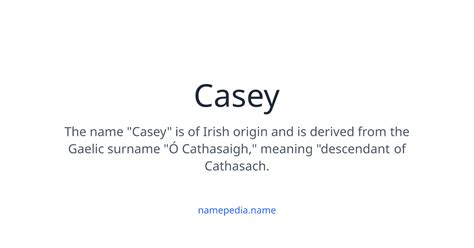 So, what does Casey actually mean? Casey is a name with Irish roots, derived from the Gaelic surname Ó Cathasaigh . This surname translates to “descendant of Cathasach.” Now, Cathasach itself is a compound word: “Cath” means battle, and “asach” means vigilant. Put it all together, and Casey essentially means “ vigilant in battle ” or “ watchful .” Pretty cool, right?