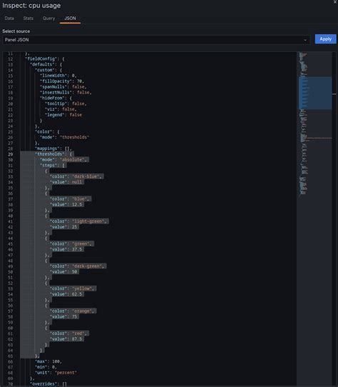 • thresholds : Defines rules for when to change colors or display alerts based on data values.