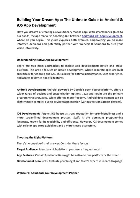 Now, let’s explore Android app development . If you want to create apps for a wide range of devices, including smartphones, tablets, and wearables, Android is your platform. Android, Google’s mobile operating system, is known for its open-source nature, vast market share, and diverse ecosystem. Developing for Android means reaching billions of users worldwide and targeting a wide range of devices. The primary languages for Android app development are Kotlin and Java . Kotlin, developed by JetBrains, is the modern and preferred language for Android development. It offers concise syntax, null safety, and interoperability with Java. Java, the older language, is still widely used in Android development, especially for legacy projects. The Android SDK provides all the tools and resources you need to build Android apps. This SDK includes Android Studio, Google’s official IDE, where you’ll write your code, design your user interface, and test your app. Android Studio is a feature-rich IDE that simplifies the development process, offering features like code completion, debugging tools, and a visual layout editor. You’ll also need to familiarize yourself with the Android platform, including its different versions, device manufacturers, and screen sizes. Android fragmentation is a major challenge, requiring developers to optimize their apps for a wide range of devices and operating system versions. You’ll need to design your app to adapt to various screen sizes, resolutions, and performance characteristics. Furthermore, you’ll need to become familiar with Android’s user interface guidelines, which provide design and usability standards for Android apps. Following these guidelines ensures that your app looks and feels like a native Android app, providing a consistent and intuitive user experience. Mastering the basics of Android app development, including the programming languages, the SDK, and the ecosystem, is the first step toward creating successful and engaging apps for the Android platform.