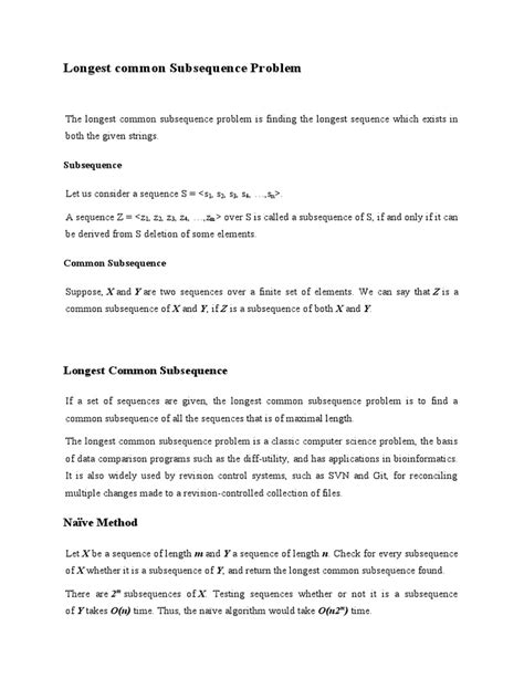The Longest Common Subsequence (LCS) problem is a classic and fundamental concept in computer science, particularly in the realm of algorithm design and dynamic programming. Guys, if you’re diving into algorithms, understanding LCS is super important! It’s not just some theoretical exercise; it pops up in various real-world applications, from bioinformatics to text editing. So, what exactly is the LCS problem? At its heart, it’s about finding the longest sequence of elements that are common to two or more sequences, but—and this is key—these elements don’t need to be consecutive. Think of it like finding the longest matching thread that you can pull from two different fabrics, where the thread pieces might be scattered throughout the fabric but appear in the same order in both. To really nail this down, imagine you have two strings, “ABCBDAB” and “BDCABA”. What’s the longest sequence of characters that appears in both, in the same order? It’s “BCBA”, which has a length of 4. Notice how the characters aren’t right next to each other in the original strings, but they maintain their order. This is what distinguishes a subsequence from a substring, where the characters must be consecutive. The LCS problem isn’t just a theoretical puzzle; it has practical applications all over the place. In bioinformatics, it’s used to compare DNA sequences and identify similarities between different organisms. In text editing, it’s used to find the differences between two versions of a document, which is the backbone of features like “track changes” and version control systems. And in data compression, it can be used to identify redundant data and reduce the size of files. Understanding the LCS problem is a stepping stone to tackling more complex algorithmic challenges. It’s a great example of how dynamic programming can be used to solve problems that seem daunting at first glance. By breaking down the problem into smaller, overlapping subproblems, we can find the optimal solution in an efficient and systematic way. So, buckle up, because we’re about to dive deep into the world of LCS and explore how to solve it using dynamic programming. It’s going to be a fun and rewarding journey, and by the end of it, you’ll have a powerful tool in your algorithmic arsenal.