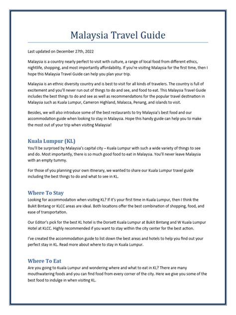 Hey guys! Planning a trip to Malaysia? You've come to the right place! Malaysia is a seriously awesome country with something for everyone. From bustling cities to pristine beaches and lush rainforests, this place has it all. Whether you're a foodie, an adventurer, a history buff, or just looking to relax, Malaysia will totally blow you away. We’re going to dive deep into everything you need to know to make your Malaysia travel experience absolutely epic. We'll cover the best times to visit, must-see destinations, delicious food, and handy tips to make your journey smooth and unforgettable. So buckle up, because we're about to embark on a virtual tour of this incredible Southeast Asian gem!