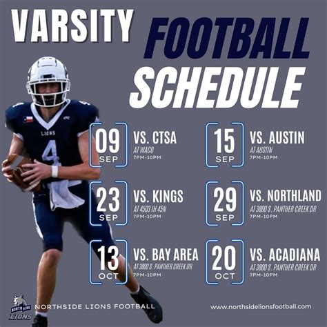 This schedule is more than just a list of games; it’s a chance to build a community, support your local team, and experience the thrill of high school football. From the first kickoff to the final whistle, the Northside High football schedule promises a season full of excitement and unforgettable memories. Get ready to cheer on your team, show your school spirit, and create lasting memories that will make you smile for years to come. The Northside High football schedule is a celebration of teamwork, dedication, and the love of the game, and we are thrilled to share it with you.