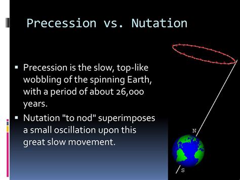 Nutation , on the other hand, is the finer, more rapid oscillation superimposed on precession. It’s a nod or a jiggle of the axis that occurs over shorter periods, most notably an 18.6-year cycle related to the Moon’s orbit. Nutation accounts for the smaller, periodic variations in the direction of Earth’s axis that are caused by the changing orientation of the Moon’s orbit relative to Earth’s equator. Think of it as the small, secondary vibrations or tremors on the spinning top. While precession describes the overall path, nutation describes the slight deviations and wiggles along that path.