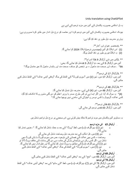 Another example can be found in the proposed amendments to local government laws in various provinces of Pakistan. These amendments often focus on issues such as decentralization of power, allocation of resources, and the role of local councils in development planning. The proposed amendments aim to improve governance at the grassroots level and empower local communities to participate in decision-making processes. In the context of Urdu literature and language, there have been proposed amendments to policies related to the promotion and preservation of the Urdu language. These amendments often seek to increase the use of Urdu in government, education, and media, as well as to protect the rights of Urdu-speaking communities. These examples highlight the diverse range of issues that can be addressed through proposed amendments in Urdu-speaking regions. They also demonstrate the importance of understanding the legal and political context in which these amendments are being considered.