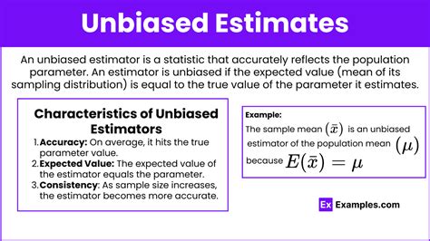 1. Expected Value: As we mentioned earlier, the expected value of an unbiased estimator is equal to the true value of the parameter being estimated. Mathematically, this can be expressed as E(θ̂) = θ, where θ̂ is the estimator and θ is the true parameter. This means that if we were to calculate the estimator for many different samples and then average those estimates together, the resulting average would be very close to the true value of the parameter.